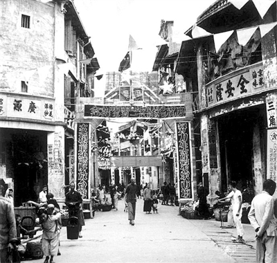 在另一张化龙路的照片中,国华照相馆旁有很大的“百花精”“柠檬露”广告。1930年左右拍摄的图片中,太平街的大字广告,有济公、永祥安百货商店、华章男女名鞋、生合栈参茸燕窝、黑鬼油……各种各样的商品,琳琅满目,衣着整洁的人们在选购心仪的物品。