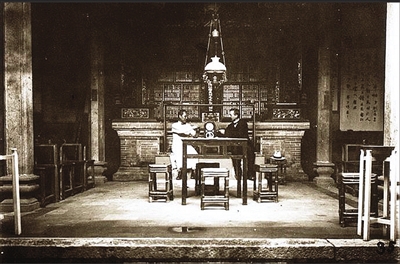 ■1910年,河源一个青年机构接待室的布局。厅堂正中吊着的是一盏煤油汽灯。(原图现藏美国南加州大学图书馆)