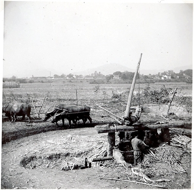 ■东江岸边,蔗农用几头牛拖着石磙压榨甘蔗。大约摄于1931年至1950年期间。
