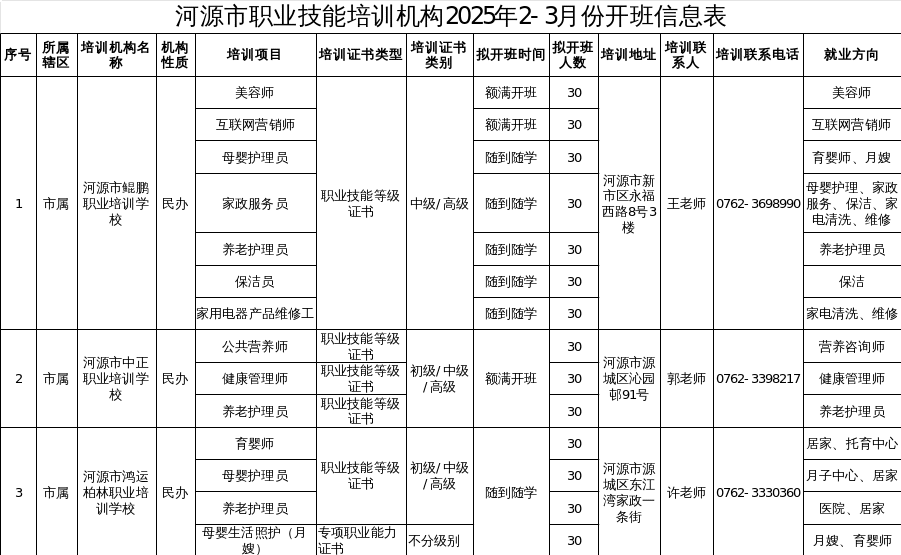 为方便河源市民参加职业技能培训,现将2025年2-3月河源市社会培训评价组织认定名单及职业技能培训机构开班信息公布如下。