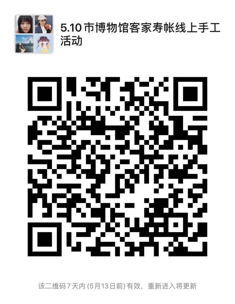 活动详情 一、活动主题 《客家寿帐》母亲节主题手工线上教学活动 二、活动时间 2020年5月10日 三、活动对象 8岁以上适龄儿童 四、活动名额 15名(额满即止) 五、活动费用 手工材料及邮寄费免费 六、活动流程 1、了解母亲节的意义; 2、线上讲解客家寿帐知识及客家人做寿的习俗文化; 3、手工老师讲解制作客家寿帐需运用到的材料和方法; 4、线上指导学员完成作品及总结点评。 七、报名方式 扫码关注“河源市博物馆”微信官方公众号—点击左下方栏目【展览服务】—【活动预约】—查看【“客家寿帐”母亲节主题手工线上教学活动】—【活动报名】—填写报名信息(报名成功后,请不要重复提交报名信息,如需取消报名,请拨打电话3618008告知工作人员) 报名成功后,请扫码入群留下您的收货人姓名、电话、地址,相关活动手工材料将以快递形式寄出。完成作品后,您需要在专属活动微信群发送作品图片,以作后期宣传展示。