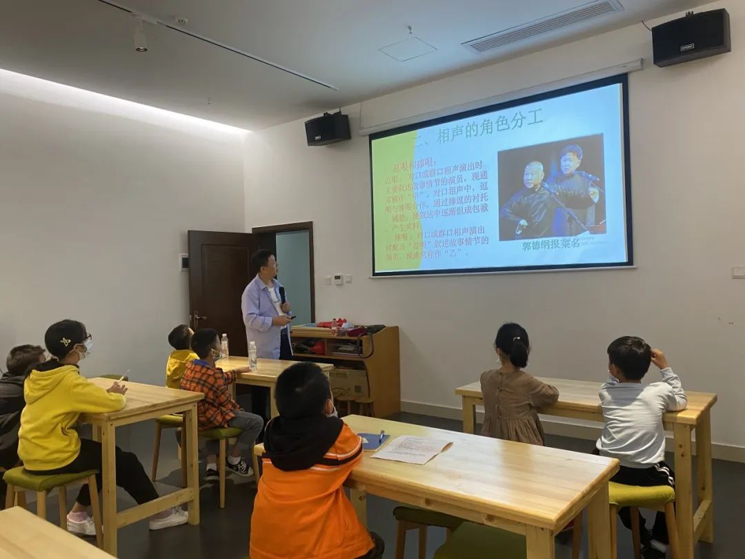 受邀主讲《相声艺术漫谈》的郭达欣老师以提问式的授课方式与学员们进行互动,激发孩子们对相声艺术的学习兴趣。        课堂中,郭老师通过对相声起源以及冯巩、郭德纲等8位相声艺术家的精彩介绍,让同学们对相声文化有初步的认识,并对相声的角色分工和基本功要求进行了详细的示范、讲解。