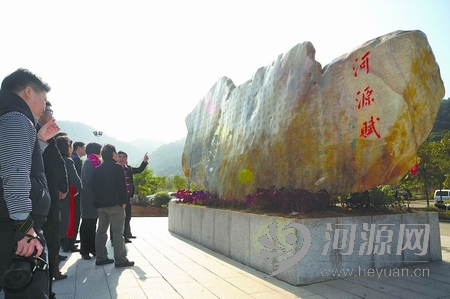 2013年11月28日,《河源赋》大型石刻在万绿湖广场(东源新港万绿湖码头)揭幕。该石刻内文为北大教授徐寒所作的《河源赋》,由徐寒本人书写,石刻材质为黄腊石。此赋约700余字,以富有文采的笔触,介绍了河源山水人文风情。该石高2.8米,长8米,重达56吨,天然外型酷似鱼形,石质坚硬温润。城以赋彰,赋以城久,该赋之刻石,为河源美景万绿湖增添了人文之气,也提升了河源的知名度和美誉度。