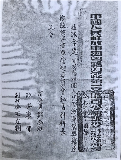 1949年6月1日,闽粤赣边纵第一支队司令部下发给李楚的派令。