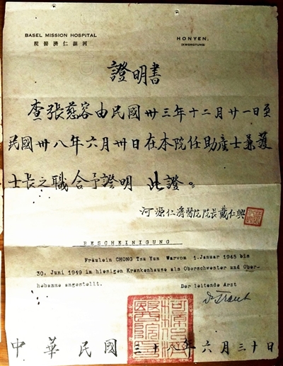 ■河源仁济医院助产士兼护士长张慈容的职业证明。(原件现藏于源城区档案馆)