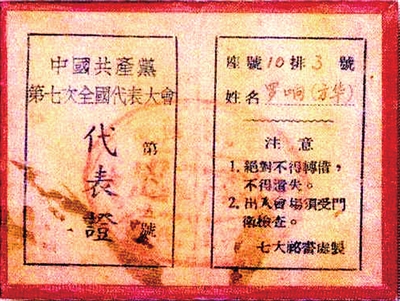 ■罗响(方华)的中共七大代表证。