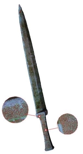 龙子山古代墓葬群挖掘出的青铜鼎虽然看起来不像中原出土的青铜礼器那样庄严肃穆、复杂精细,只是一个在地底埋藏2000多年的炊煮器,但也不是普通人家能带到坟墓里去的,它用以“明尊卑,别上下”。春秋战国时期,一般只有士一级才能有一鼎随葬。修复后呈现在我们眼前的这只青铜鼎,因为在两三千年间保存得并不是太好,经过省文物部门的修复,亦是三足鼎立,乍看之下,虽是锈迹斑斑略显简陋的样子,仍透露着数千年前的生活气息,比较平易近人。鼎足略高,让人不免有点担心。和平县博物馆对它的描述:“小平沿外折,侈口,颈稍内收,腹微鼓,圜底,方型竖耳,凹圆柱形足,足内残留泥质内范。腹上部铸两单层带状花纹,上为三角云雷纹,下为圆圈纹,器壁薄,器表布有烟炱。”猜测这个铜鼎曾是墓主人生前使用过。专家认为,该鼎与广东出土的越式鼎相类似,是本地青铜文化的产物。