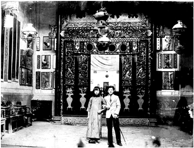 ■1932年的和平林寨谦光楼,富家子弟陈昌平与其新婚妻子、河源籍女子邝丽鸳。(原图现藏林寨)