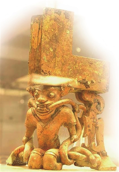 越人操蛇鎏金铜托座,是南越王墓出土的屏风构件。力士低鼻大眼、着短裤与短袖葛衣、跣足,是典型的越人。资料图片