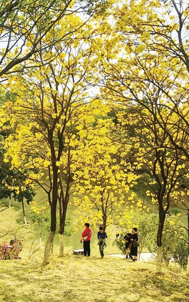 ■春日,河源客家文化公园内的黄花风铃木鲜花盛开。清明前后,也是人们踏青的好时节。