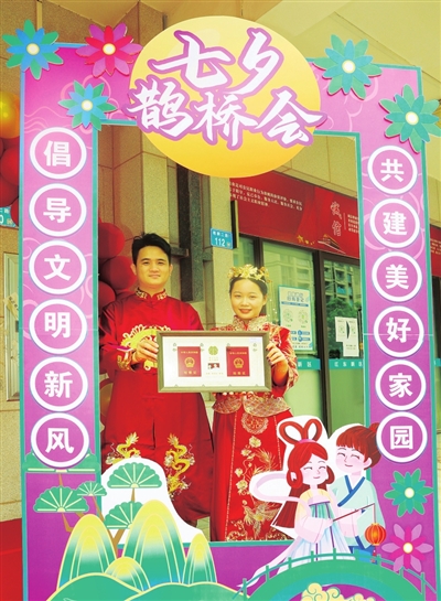 ■七夕当天,市区一对新人喜领结婚证。 本报记者 肖斌 摄