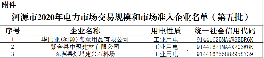 根据《广东省发展和改革委关于2020年电力市场交易规模和市场准入有关事宜的通知》(粤发改能源函〔2019〕3604号)要求,我局会同河源供电局筛选出华比亚(河源)婴童用品有限公司、紫金县中冠建材有限公司、东源县灯塔建兴石料场,上述三家属于工、商业用户市场准入门槛为年度用电量200万千瓦时以上用户(详细见附件),符合广东电力市场电力一般用户市场准入资格。