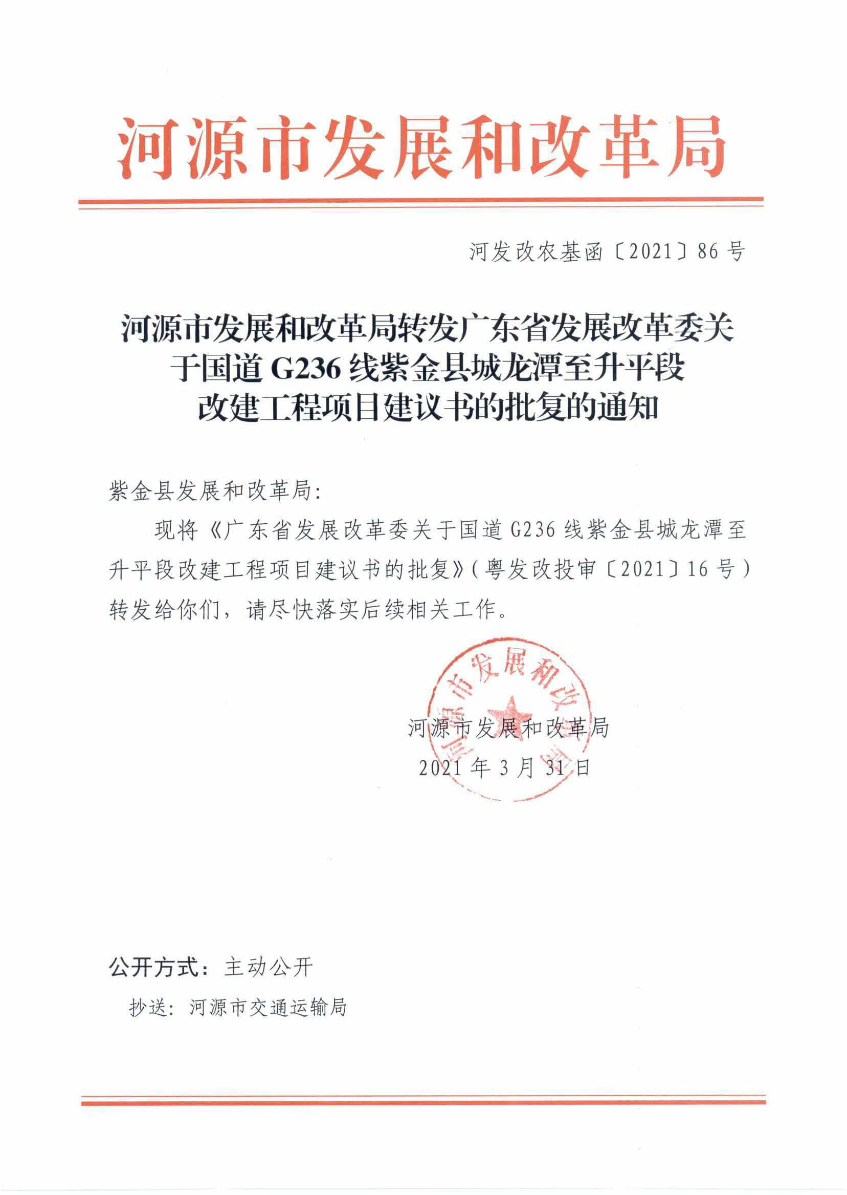 河源市发展和改革局关于转发广东省发展改革委关于国道g236线紫金县城龙潭至升平段改建工程项目建议书的批复的通知