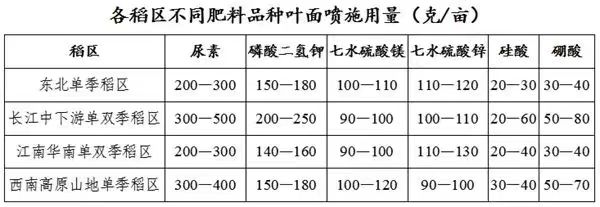 注:每亩用水量不少于3升,取肥料用量上限时,用水量不少于5升。喷施肥液浓度尿素不超过10%,磷酸二氢钾不超过3%,七水硫酸镁和七水硫酸锌不超过3%,硼酸不超过2%,硅酸不超过2%。