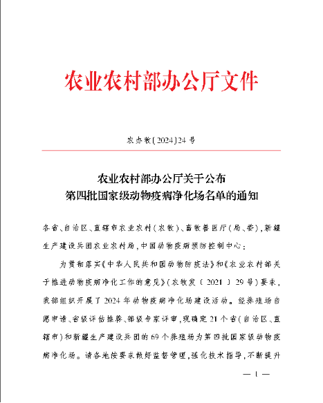 近日,农业农村部办公厅公布的第四批国家级动物疫病净化场名单中,我市河源市兴泰农牧股份有限公司赫然在列,成为河源市首家成功创建国家级动物疫病净化场的企业,也是第四批中广东唯一一家通过的企业。