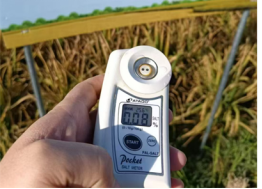 专家组按照水稻品种实收测产要求,在对百亩示范方进行整体考察的基础上,随机抽取3块田,采用收割机进行收割脱粒,当场装袋称重计产、丈量面积,称重后每块田称取3公斤鲜稻谷样本测定杂质率和水分含量,最终计算出稻谷实际产量。根据取样3块田实收测产结果,100亩示范方折合标准产量为平均亩产501.98 公斤干谷。与此同时,专家组对示范种植田块进行了pH值检测及含盐量测定。经过多轮多点采样,最终得出种植田块 pH 平均值为 9.2,平均含盐量为 0.8%,具有较高的盐碱胁迫度。