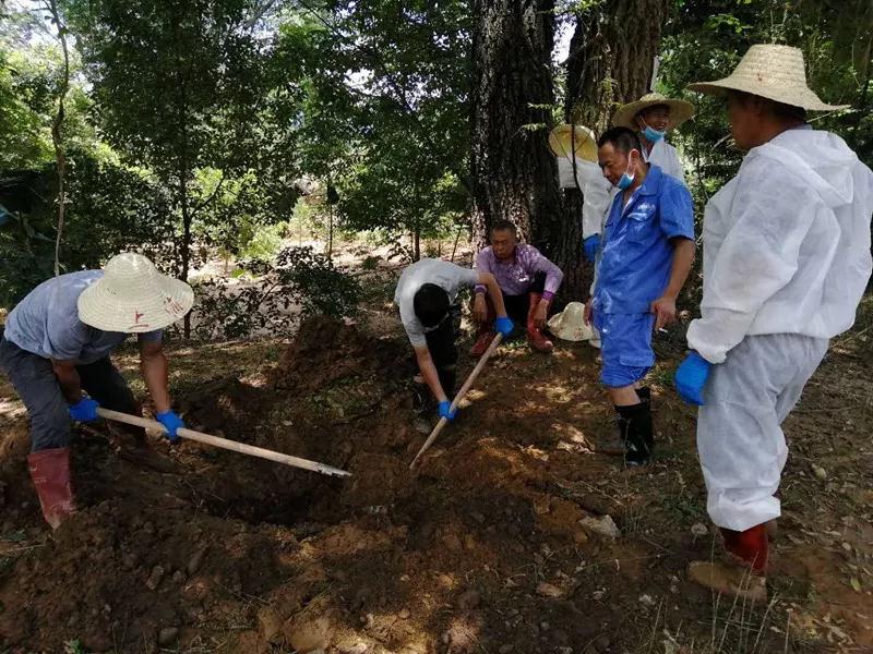 6月22日,接群众举报,内莞镇小洞未开发的暗岩处发现有洪水后停滞在岩内的死亡猪十四头,死亡禽百余只。当时洞内臭味严重,且是莞村新建自然村的饮水源,连平县农业农村部门立即组织力量,配备手电、麻袋、锄头、铁铲、防腐服、口罩等,深入洞内清洁。虽然洞内无路,有些峡缝甚至不到一米宽,任务异常艰巨,但全体农业人不畏艰险,奋战五小时,终于安全完成大部分清理工作,后天将完成全部清理工作,全力保障群众的饮水安全。