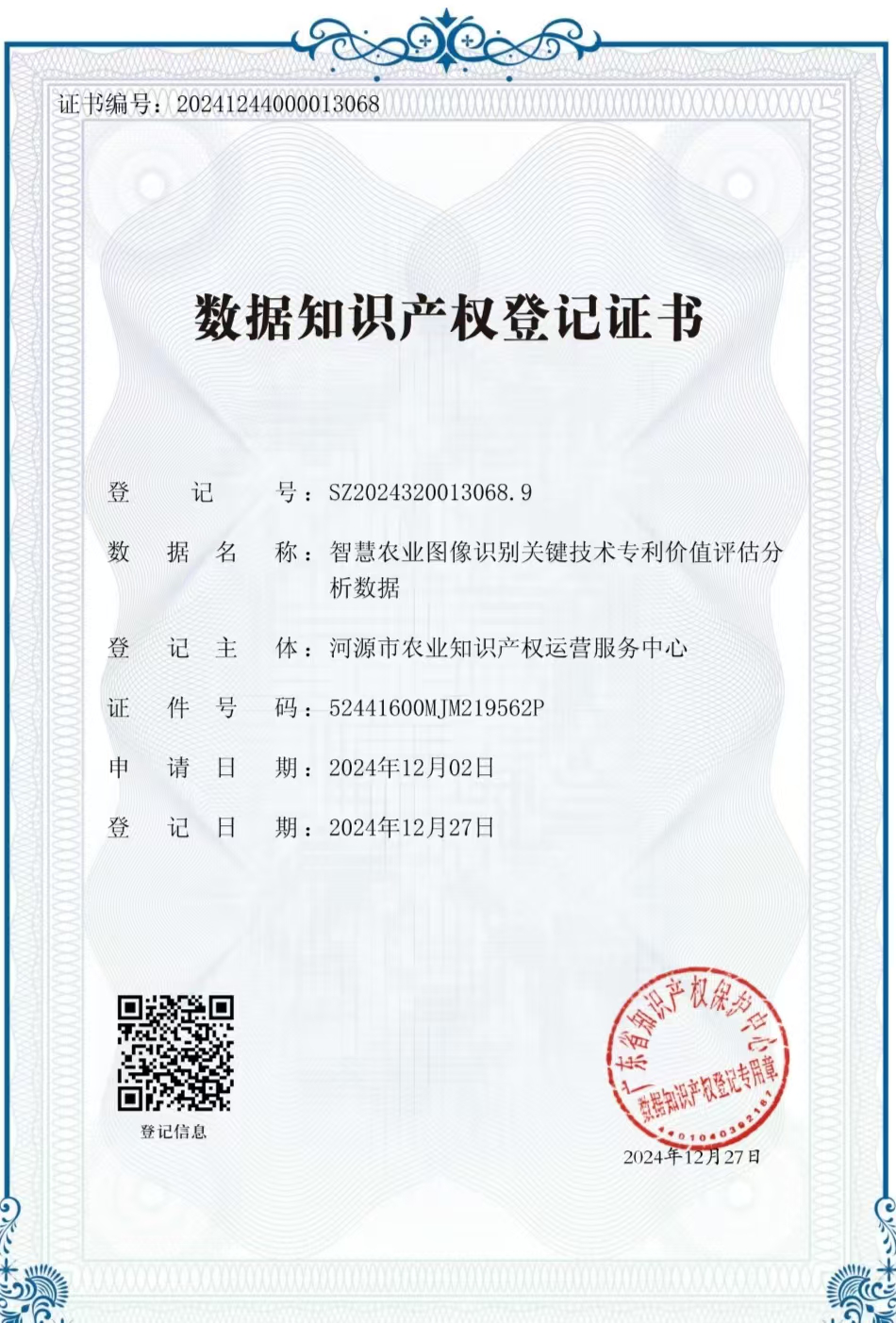 近日,河源市农业知识产权运营服务中心申报的“智慧农业图像识别关键技术专利价值评估分析数据”成功获颁《数据知识产权登记证书》,我市数据知识产权登记成功破“零”,迈出了数据资源化走向数据资产化的关键一步。