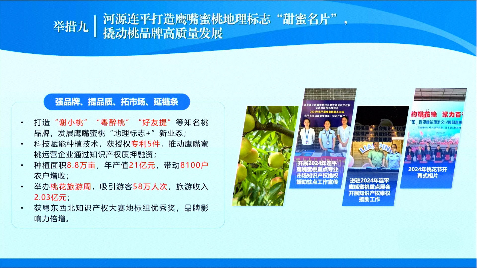 日前,广东省市场监督管理局(知识产权局)召开发布会,对外发布2024年度广东知识产权“十大事件”和15项“基层改革创新举措”。其中,我市“河源连平打造连平鹰嘴蜜桃地理标志‘甜蜜名片’,撬动桃品牌高质量发展”经过初步筛选、网络投票、专家评审等环节,成功入选2024年度广东知识产权“基层改革创新举措”。