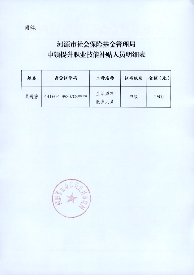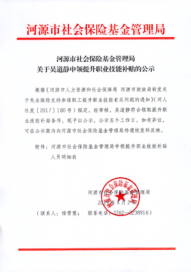 河源市社会保险基金管理局关于吴道静申领提升职业技能补贴的公示