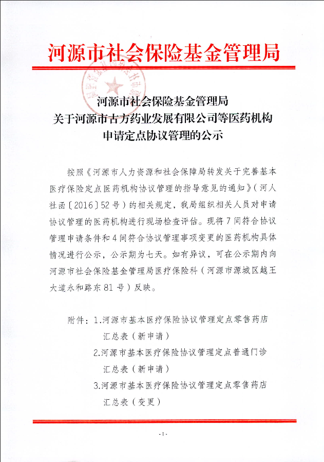 河源市社会保险基金管理局关于河源市古方药业发展有限公司等医药机构申请定点协议管理的公示