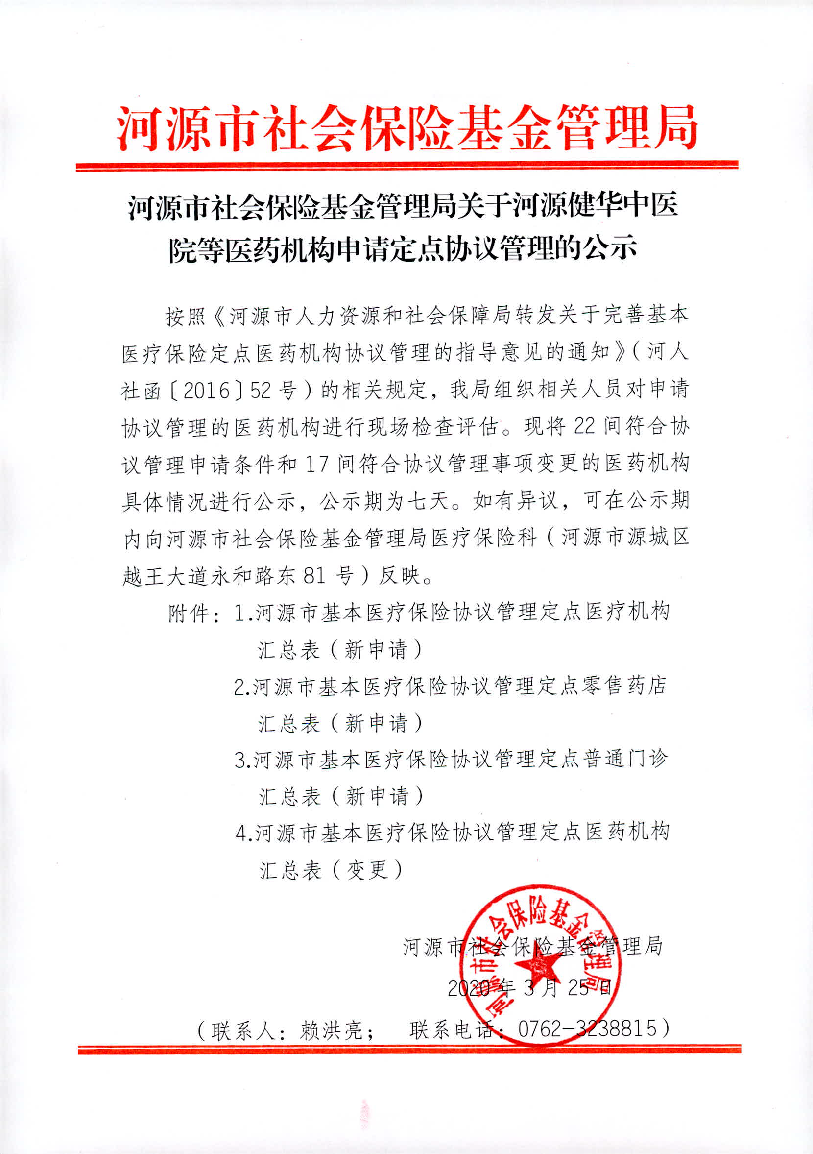 河源市社会保险基金管理局关于河源健华中医院等医药机构申请定点协议管理的公示