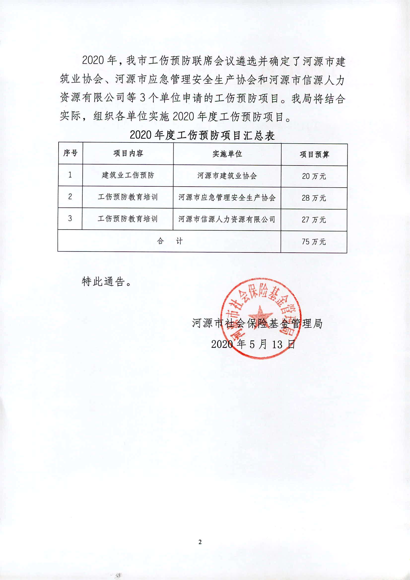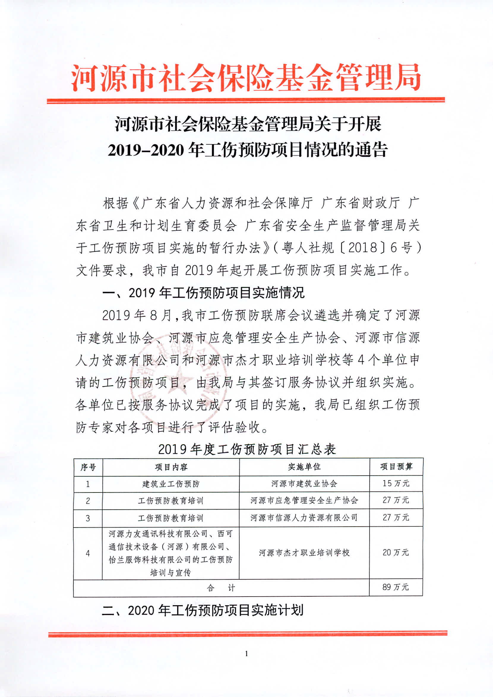 河源市社会保险基金管理局关于开展2019-2020年工伤预防项目情况的通告