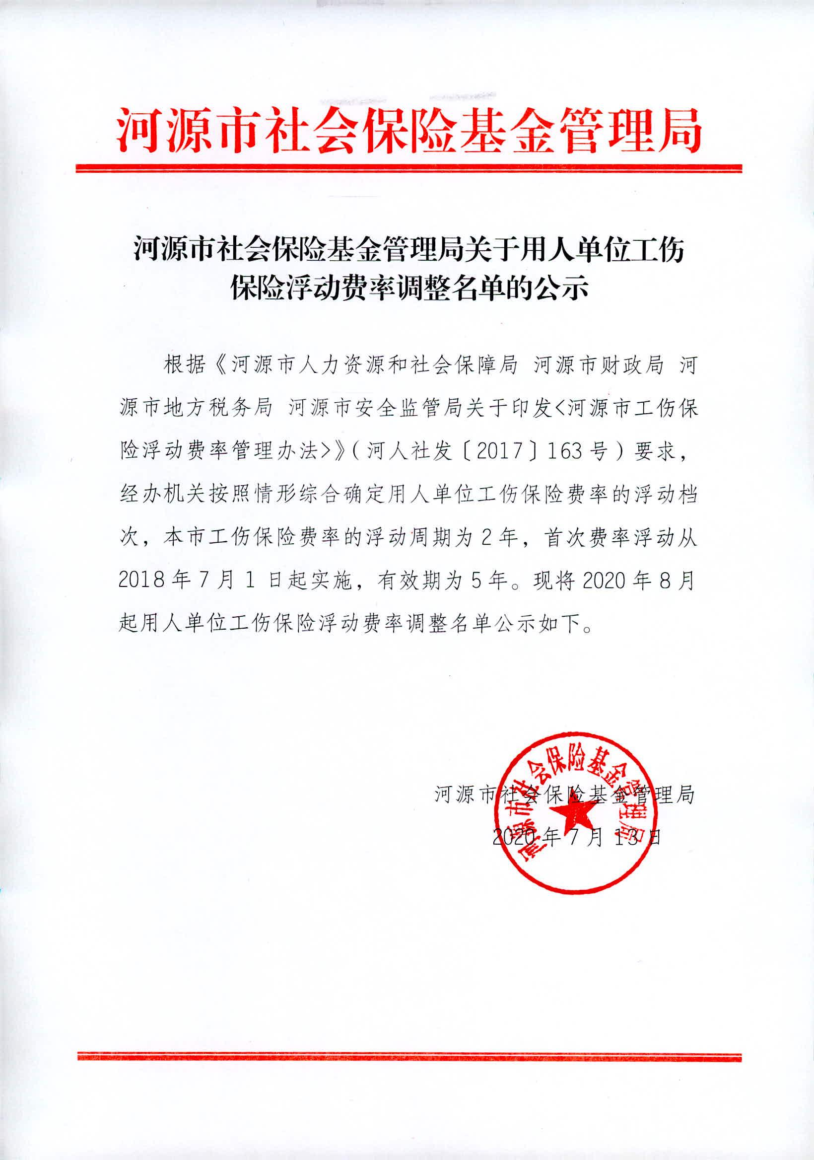 河源市社会保险基金管理局关于用人单位工伤保险浮动费率调整名单的公示