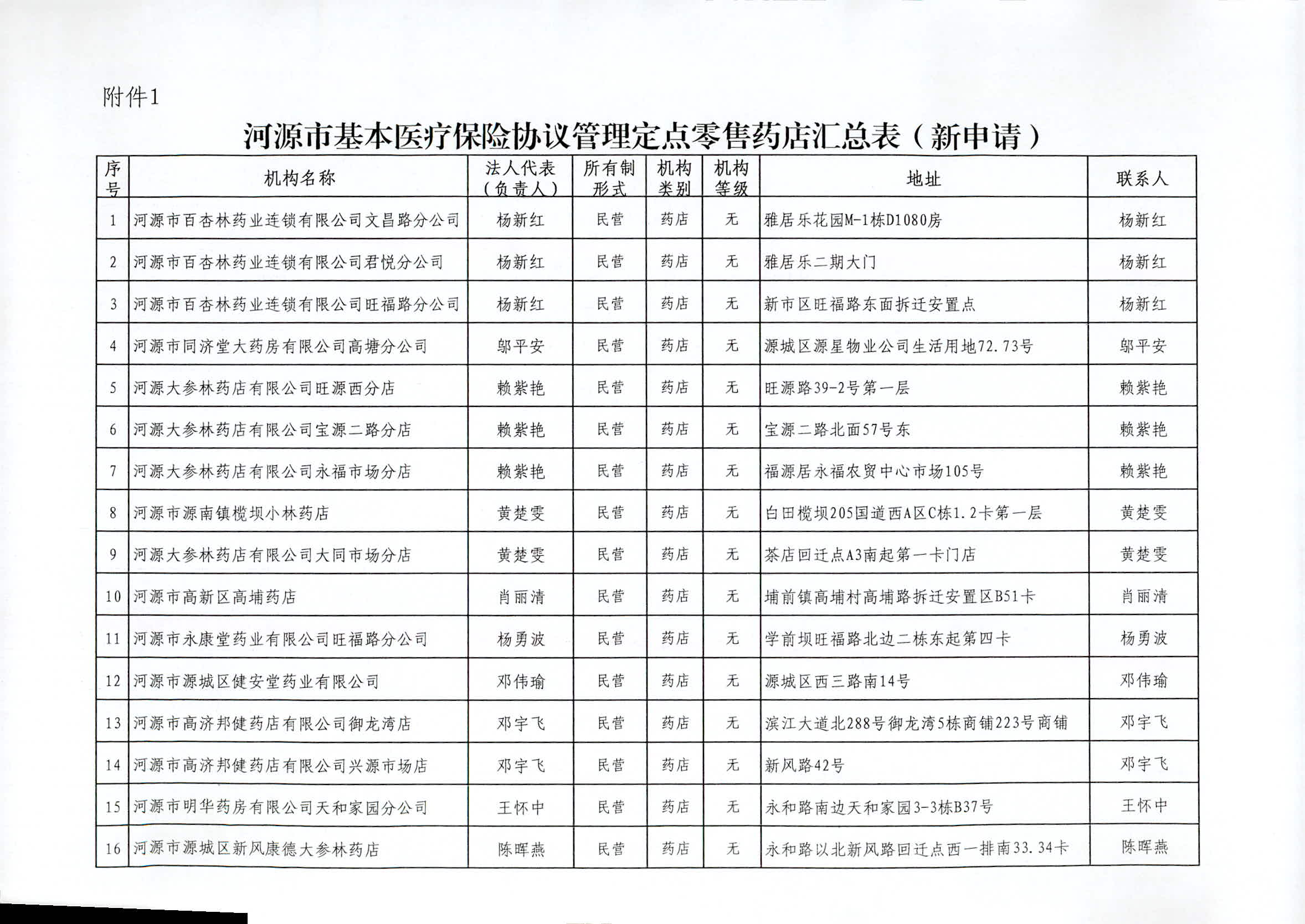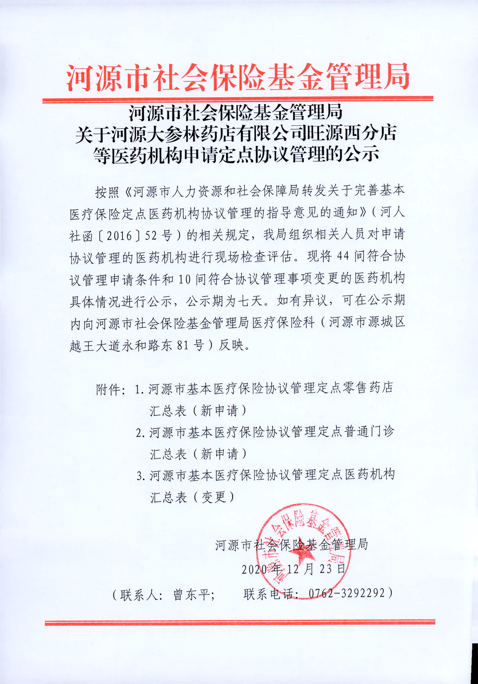 河源市社会保险基金管理局关于河源大参林药店有限公司旺源西分店等医药机构申请定点协议管理的公示