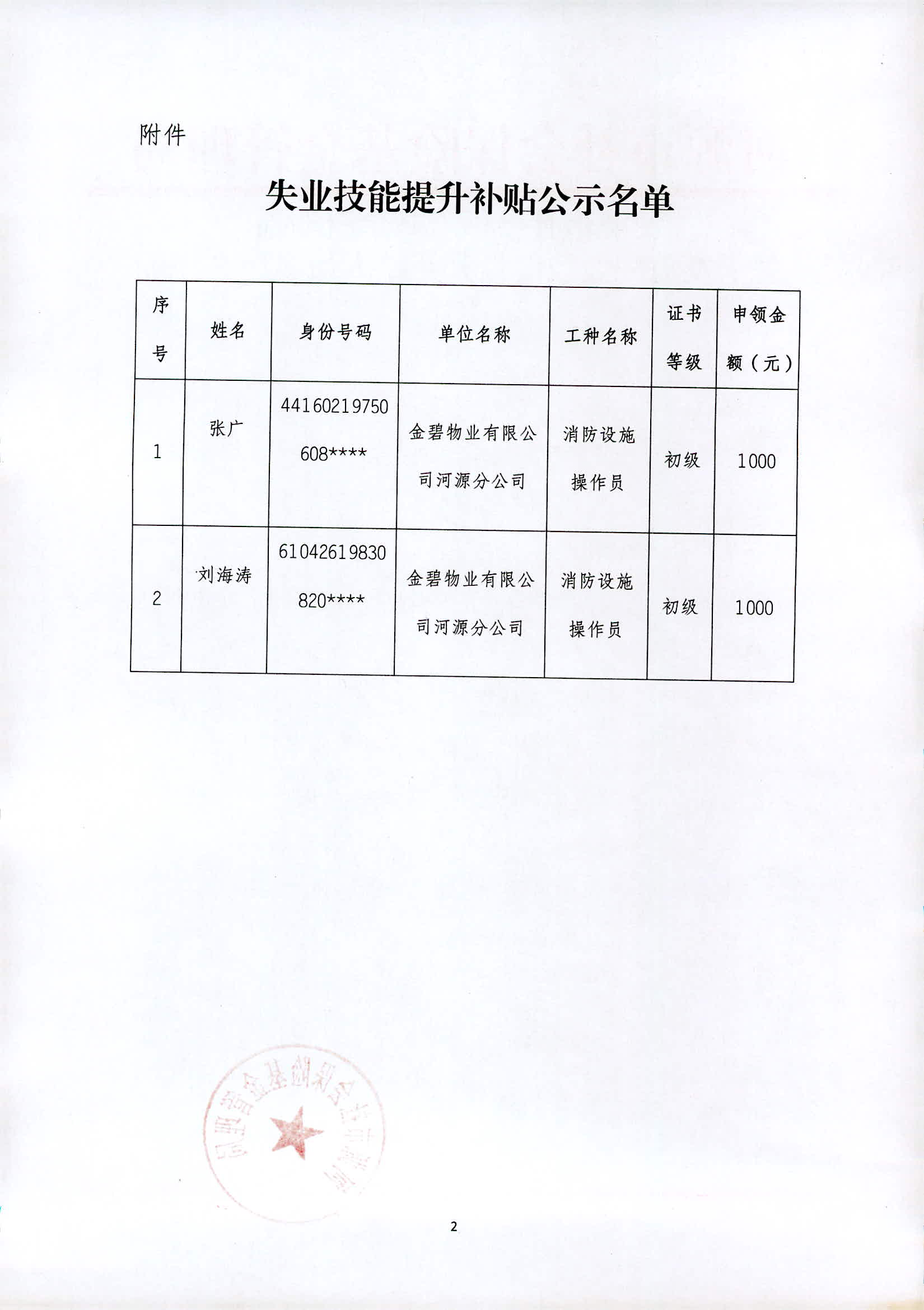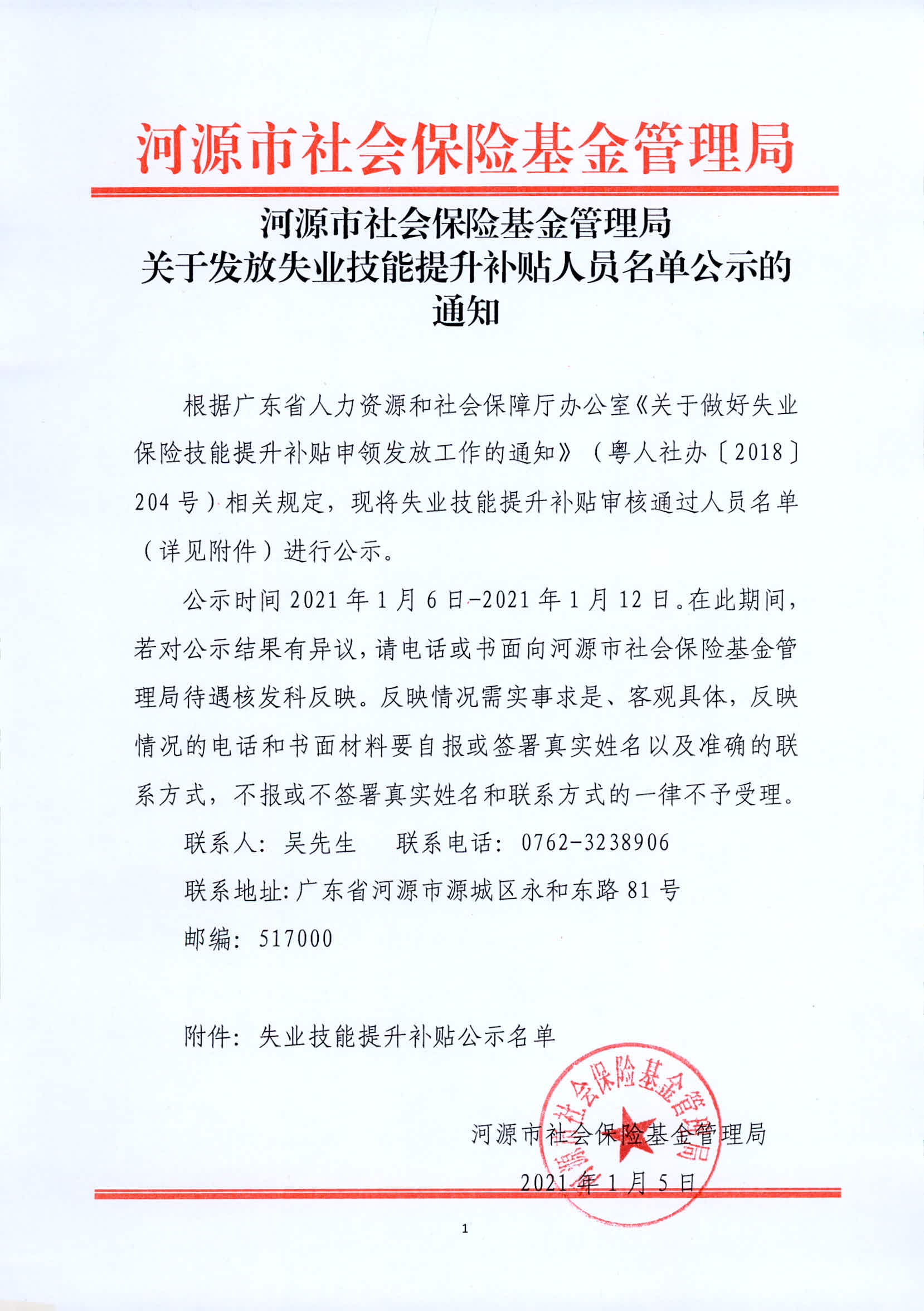 河源市社会保险基金管理局关于发放失业技能提升补贴人员名单公示的通知