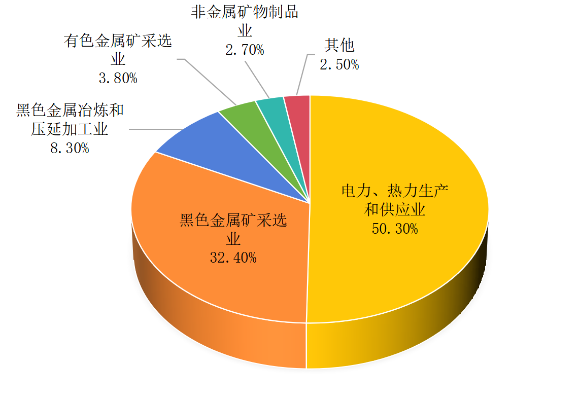 2023年,一般工业固体废物产生量排名前5的行业为电力、热力生产和供应业、黑色金属矿采选业、黑色金属冶炼和压延加工业、有色金属矿采选业、非金属矿物制品业,分别占全市一般工业固体废物产生量的50.3%、32.4%、8.3%、3.8%、2.7%,详细情况见图1。