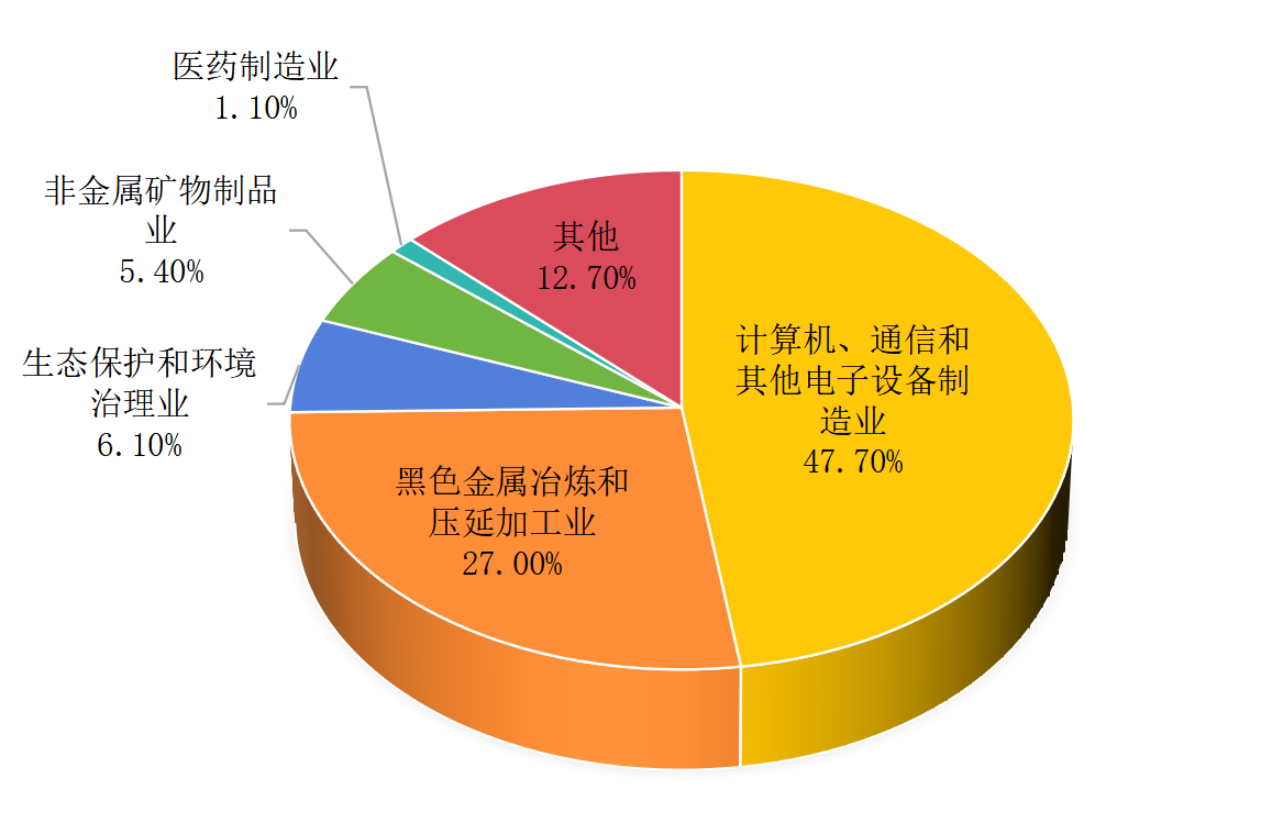 2023年,本市危险废物产生量排名前五的行业依次为计算机、通信和其他电子设备制造业、黑色金属冶炼和压延加工业、生态保护和环境治理业、非金属矿物制品业、医药制造业,分别占全市危险废物产生总量的47.7%、27.0%、6.1%、5.4%、1.1%,详细情况见图2。