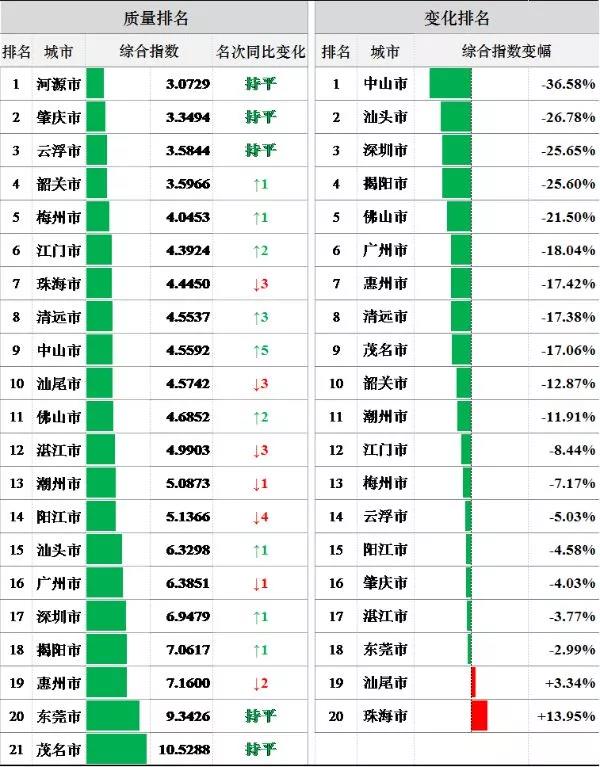 8月14日,广东省生态环境厅公布了今年1~6月全省城市空气和水环境质量及排名情况。按照环境空气质量综合指数排名,前四位为汕尾、茂名、湛江和河源市,后三位为广州、佛山和东莞市。全省21市环境空气质量同比均有所改善。而在全省城市水环境质量排名中,河源市位列榜首。