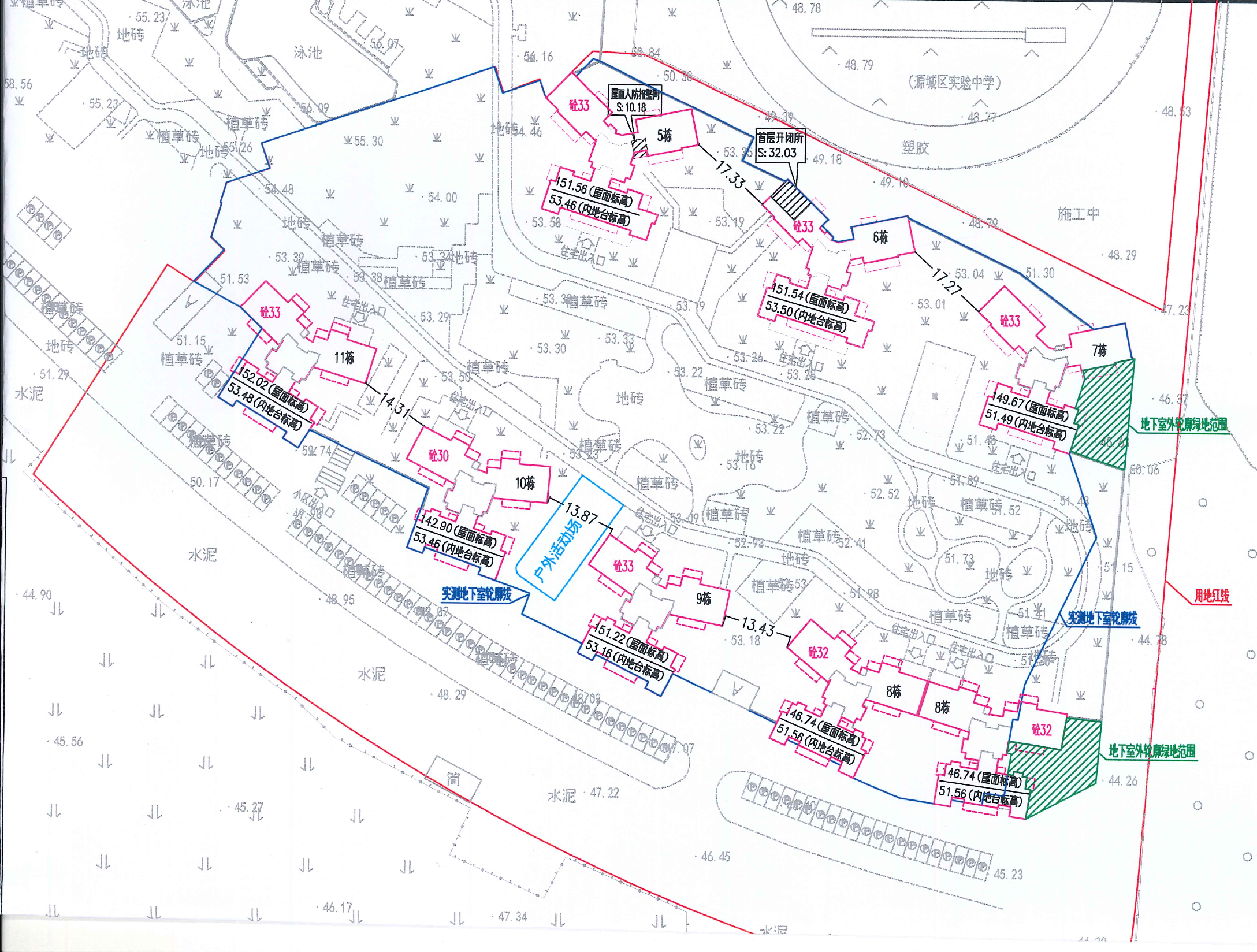龙光城四期二组团项目位于河源大道东边、风光大道南边河源龙光城项目内,该项目已于2020年11月办理了建设工程规划许可证,用地面积30413.79平方米,总建筑面积为139758.14平方米,规划含7栋高层住宅楼和整体一层地下室,现项目已建设完成。近日,建设单位向我局申请办理规划条件核实。经核对该项目建设工程规划许可证附件、附图、测绘报告及现场踏勘,发现该项目建设现状较规划存在局部调整,即7栋、8栋住宅楼东侧、原规划地下室外侧挑板部分未建设,导致该部分绿地标高由原规划与小区内地台标高(约51.4)一致调整为与风光纵一路道路标高(约44.0)基本一致(详见附图),项目总绿地面积、位置维持原方案不变。