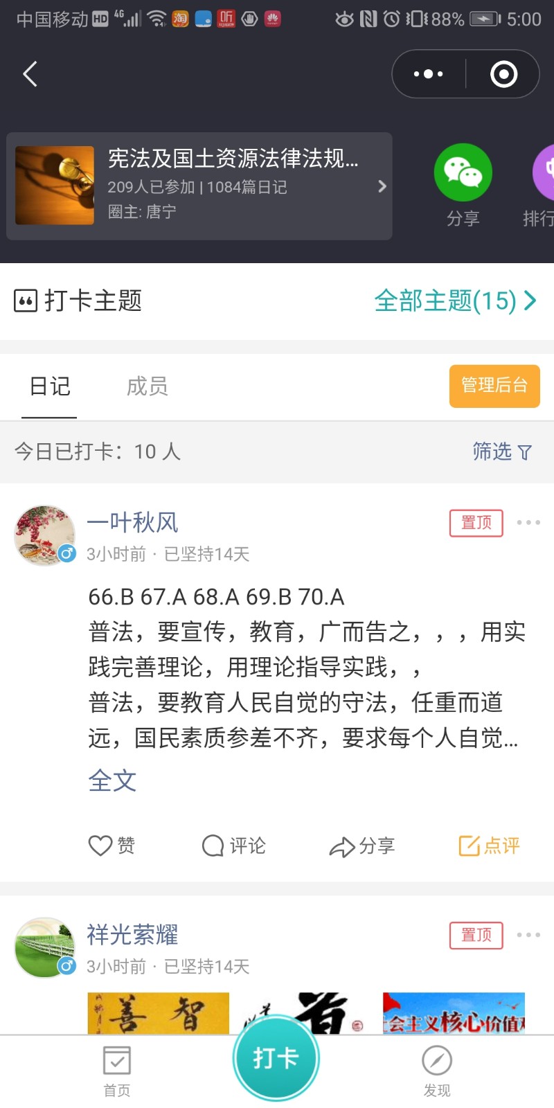为提高普法实效,调动学法热情,今年的“12.4”法治宣传周,我局利用新型宣传媒介微信安排了宪法及国土资源法律知识15天打卡学习,从12月1日至12月15日,打卡程序系统每日从130道宪法及国土资源法律法规题库中随机抽取5道选择题或1道简答题参与只需登录微信程序进行答题即可。在学习打卡期间,我局利用办公系统及工作微信群发动全市国土资源系统内工作人员广泛参与,截至打卡结束,系统内共有209人参加,打卡次数多达1100次,坚持13日打卡人数多达100人次。