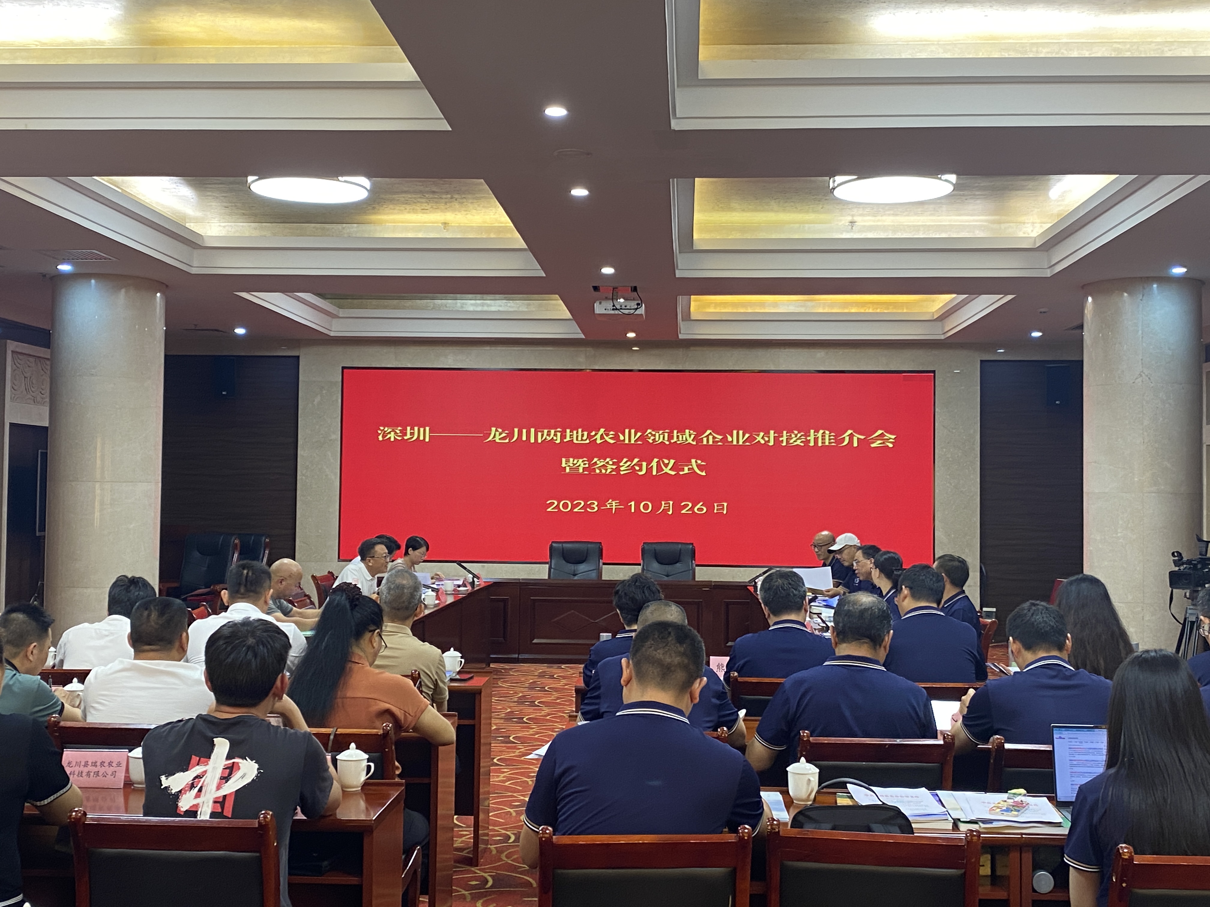 深圳——龙川两地农业领域企业对接推介会暨签约仪式在龙川县松林宾馆一楼会议室召开,深圳市乡村振兴和协作交流局党组成员、市委农办专职副主任欧阳卫国,龙川县政府副县长陈育晚,“百县行”考察团一行以及其他成员县级相关部门分管领导和龙川本地10余家农业企业代表参加会议。会议由龙川县委常委、副县长,深圳对口帮扶龙川工作组组长张明明主持。