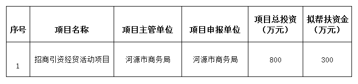 为做好深圳对口帮扶协作河源工作,不断推进产业协作的高质量发展,经研究,深圳对口帮扶协作河源指挥部拟将“招商引资经贸活动项目”列入帮扶项目2023年度计划(详见附件)。根据有关规定,现予以公示,自2023年11月15日至2023年11月24日止。