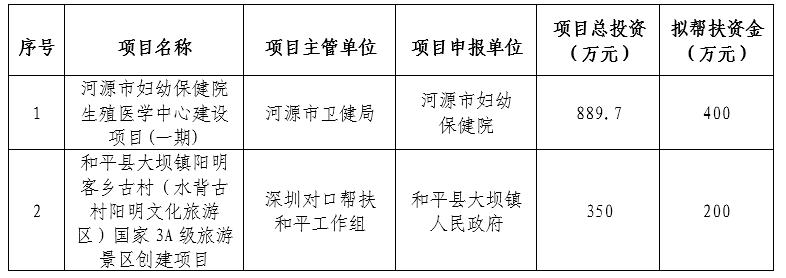 为做好深圳对口帮扶协作河源工作,不断推进社会民生和乡村振兴帮扶工作的高质量发展,经研究,深圳对口帮扶协作河源指挥部拟将“河源市妇幼保健院生殖医学中心建设项目(一期)”“和平县大坝镇阳明客乡古村(水背古村阳明文化旅游区)国家3A级旅游景区创建项目”等2个项目列入深圳对口帮扶协作河源2023年度专项资金帮扶计划(详见附件)。根据有关规定,现予以公示,自2024年1月4日至2024年1月10日止。