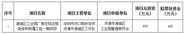 为做好深圳对口帮扶协作河源工作,不断推进产业协作的高质量发展,经研究,深圳对口帮扶协作河源指挥部拟将源城区工业园厂房及综合楼装修和附属工程一期项目列入深圳对口帮扶协作河源2023年度专项资金帮扶计划(详见附件)。根据有关规定,现予以公示,自2024年7月30日至2024年8月5日止。