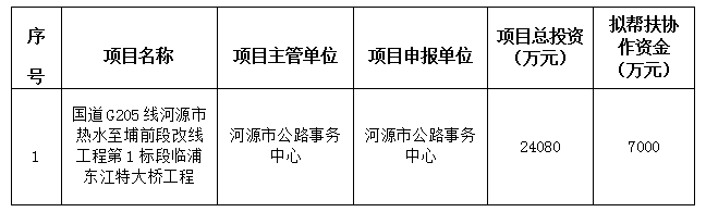 为做好深圳对口帮扶协作河源工作,不断推进产业协作的高质量发展,经研究,深圳对口帮扶协作河源指挥部拟将“国道G205线河源市热水至埔前段改线工程第1标段临浦东江特大桥工程”列入深圳对口帮扶协作河源2024年度专项资金项目计划(详见附件)。根据有关规定,现予以公示,自2024年9月6日至2024年9月12日止。