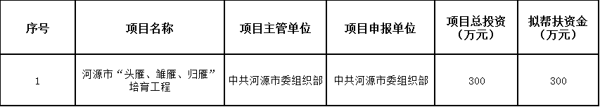 为做好深圳对口帮扶协作河源工作,助力河源人才振兴,经研究,深圳对口帮扶协作河源指挥部拟将《河源市“头雁、雏雁、归雁”培育工程》项目列入2024年度帮扶协作资金项目计划(详见附件)。根据有关规定,现予以公示,自2024年11月12日至2024年11月18日止。
