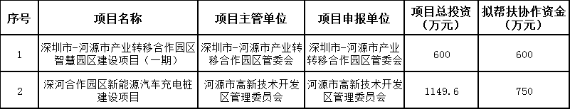 为做好深圳对口帮扶协作河源工作,不断推进产业协作的高质量发展,经研究,深圳对口帮扶协作河源指挥部拟将“深圳市-河源市产业转移合作园区智慧园区建设项目(一期)”、“深河合作园区新能源汽车充电桩建设项目”2个项目列入2024年度帮扶协作资金项目计划(详见附件)。根据有关规定,现予以公示,自2024年12月3日至2024年12月9日止。