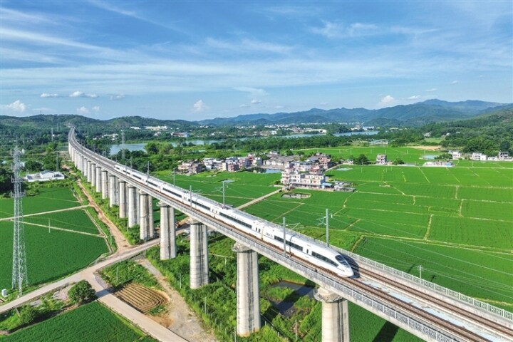 7月21日,一列高铁经过东源县柳城镇上坝村。