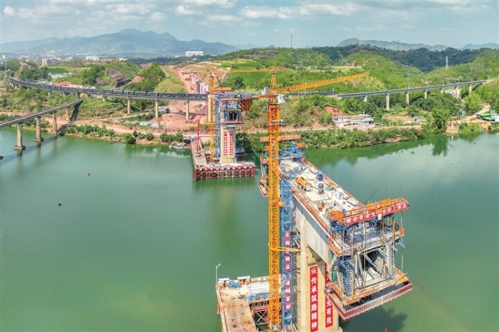 2022年10月2日,梅龙高铁龙川段东江特大桥项目正在施工。工人们在5号墩和6号墩上进行洒水养护、模板安装、钢筋绑扎等工作。