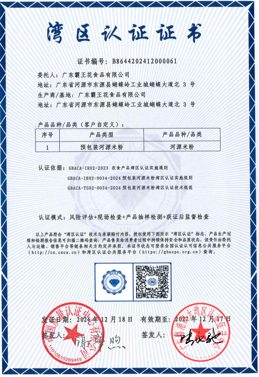 近日,广东霸王花食品有限公司的“河源米粉”产品喜获由广东粤港澳大湾区认证促进中心和中国质量认证中心有限公司共同颁发的《湾区认证证书》,这是河源首个地理标志保护产品通过此项认证,开辟了我市地理标志保护产品品牌之路的新里程。