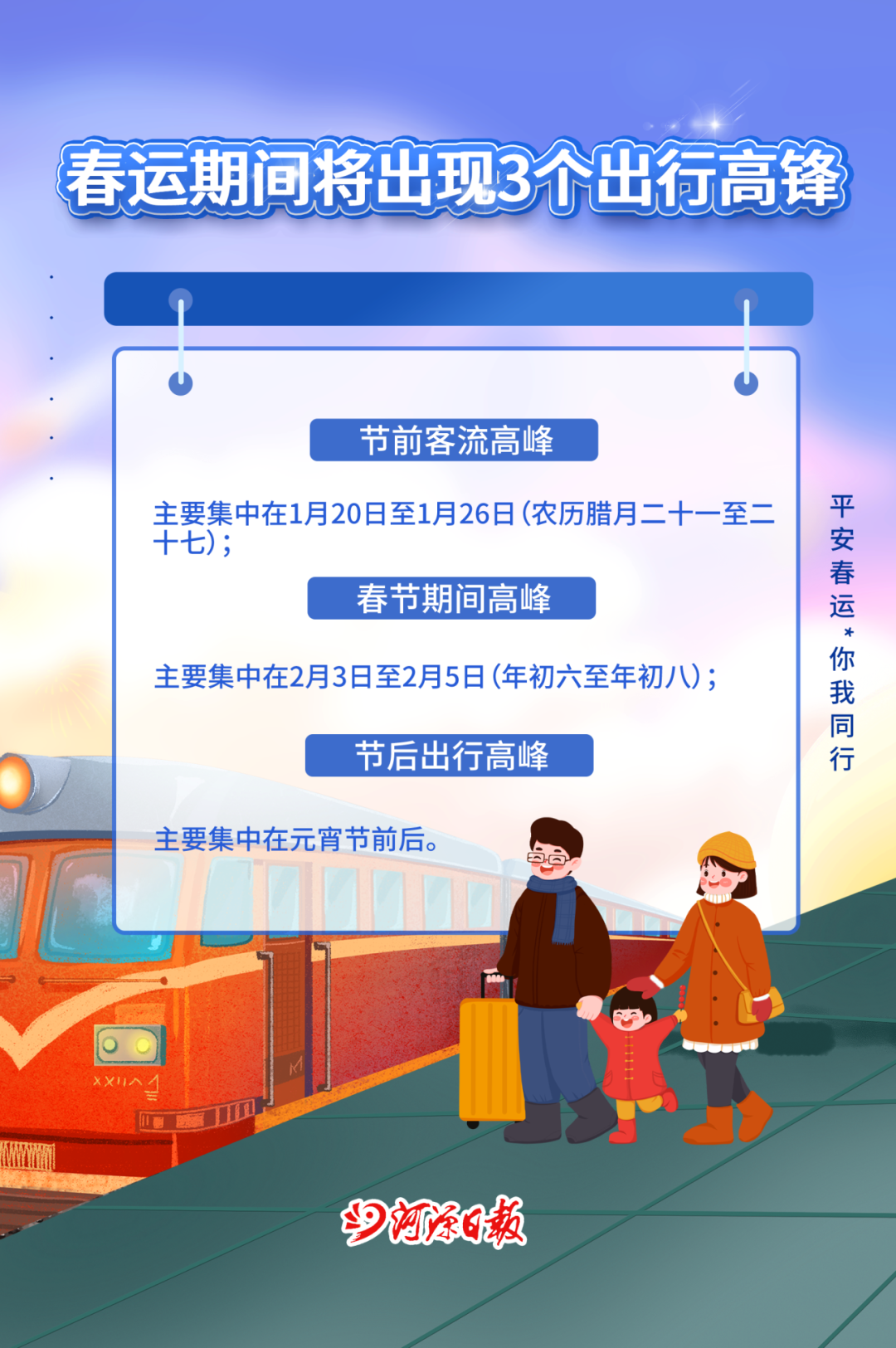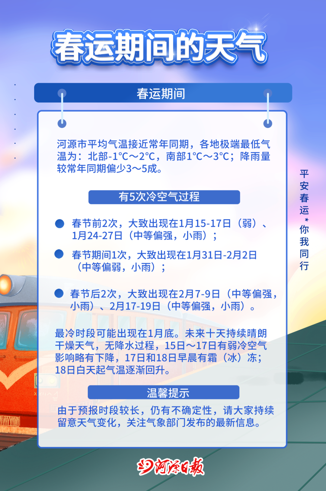 河源市公安、团市委等部门将提升运输服务水平,着力做好重点区域、重点路段的运行监测,实施春运“情满旅途”“暖冬行动”等活动;结合春运主题深入推进“美丽乡村行”交通安全巡回宣讲,发挥好劝导站、执法小分队、派出所作用;在全市各级火车站、高铁站、汽车客运站等交通站点,科学设置春运志愿服务岗位;结合客流量及时调配力量,对春运期间重点车站、重点区域、重点时段予以重点保障。