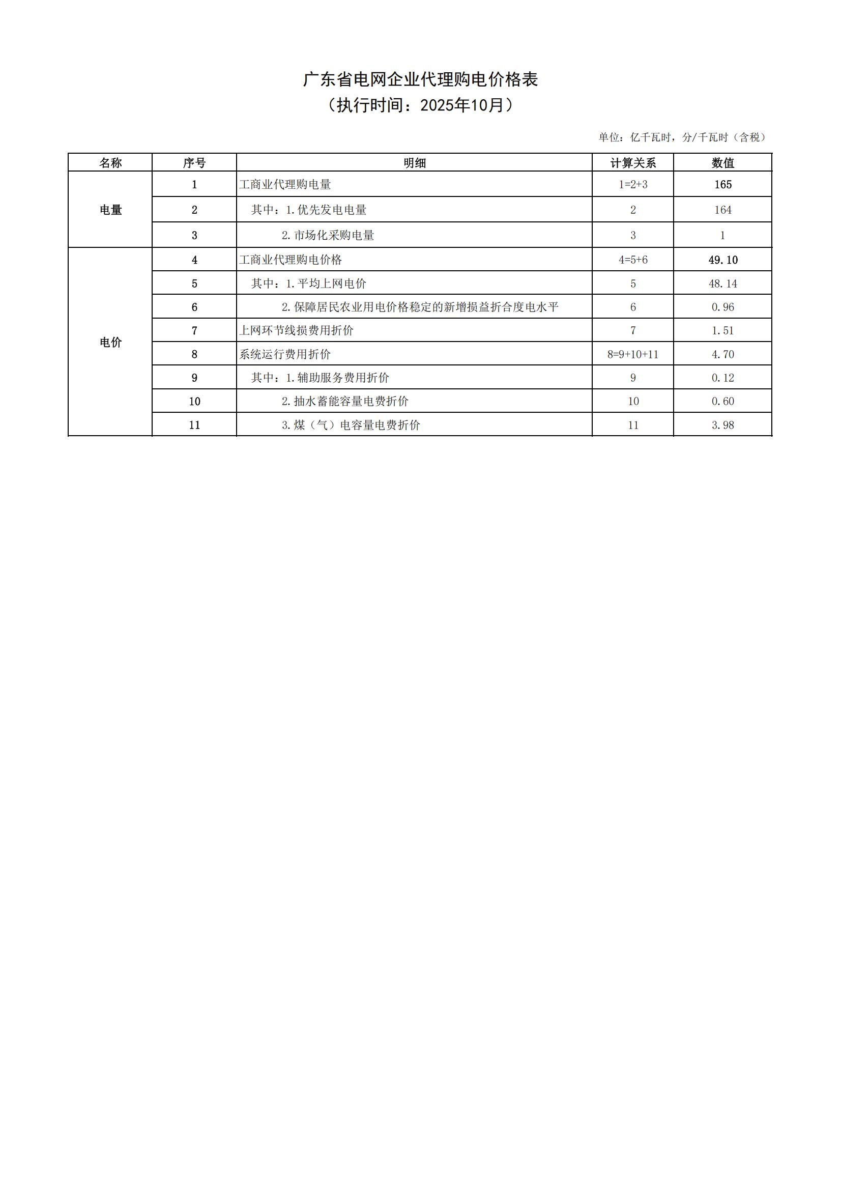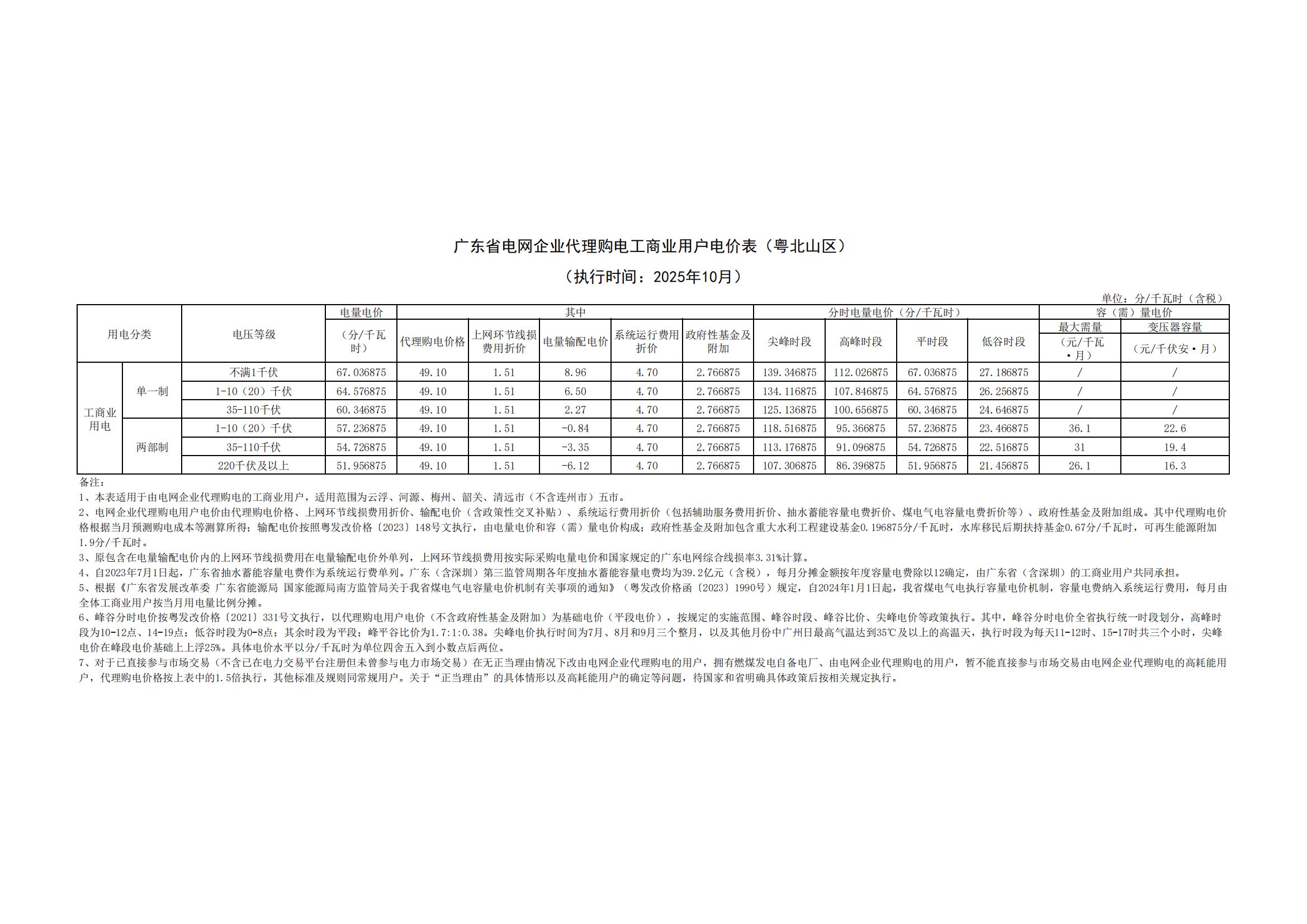 广东省电网企业代理购电工商业用户电价表(粤北山区)