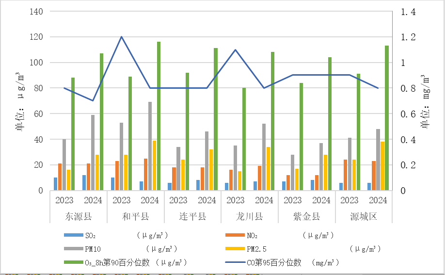 根据国家对河源市环境空气考核的情况,2024年12月我市环境空气质量综合指数为3.42,达标天数31,达标率为100%,其中优的天数为11天,良的天数为20天。空气首要污染物为PM2.5和O3-8h。我市SO2、NO2、PM10和PM2.5浓度均值分别为6μg/m3、23μg/m3、50μg/m3和39μg/m3,CO日均浓度第95百分位数为0.8mg/m3,O3日最大8小时浓度第90百分位数为115μg/m3,除PM2.5外均符合《环境空气质量标准》(GB3095-2012)二级标准限值要求。