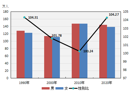全市常住人口[2]中,男性人口为1448488人,占51.04%;女性人口为1389198人,占48.96%。总人口性别比(以女性为100,男性对女性的比例)由2010年第六次全国人口普查的100.24上升为104.27。