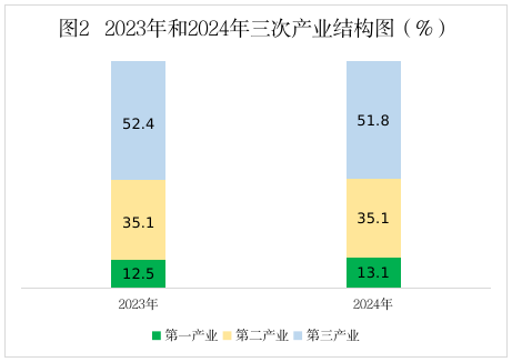 根据广东省地区生产总值统一核算结果,2024年河源实现地区生产总值(初步核算数)1407.72亿元,比上年增长2.2%。其中,第一产业增加值184.44亿元,增长5.0%,对地区生产总值增长的贡献率为28.9%,拉动地区生产总值增长0.6个百分点;第二产业增加值493.78亿元,增长3.0%,对地区生产总值增长的贡献率为48.2%,拉动地区生产总值增长1.1个百分点;第三产业增加值729.50亿元,增长0.9%,对地区生产总值增长的贡献率为22.9%,拉动地区生产总值增长0.5个百分点。三次产业结构由上年的12.5:35.1:52.4调整为13.1:35.1:51.8,第一产业比重比上年提高了0.6个百分点,第二产业比重与上年持平,第三产业比重比上年回落了0.6个百分点。人均地区生产总值49609元,增长2.2%。